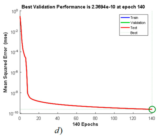 (a) Time diagrams of the input signals x1 and x2 for training the neural network; (b) Time diagrams of the input signals y1 and y2 for testing the neural net; (c) Time diagrams of the desired and the output signal of the neural network after testing and time diagram of the error signal expressed as a difference between the desired and the output signal of the feed-forward neural network; (d) A visualization of the minimizing of the mean square error over epochs.