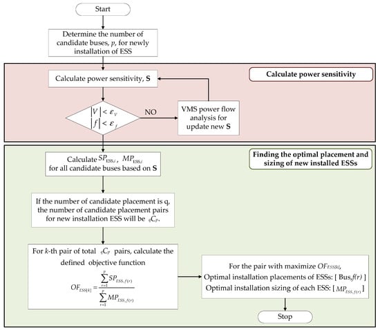 Flowchart for the optimal placement and sizing of a newly installed ESS based on the power sensitivity analysis.