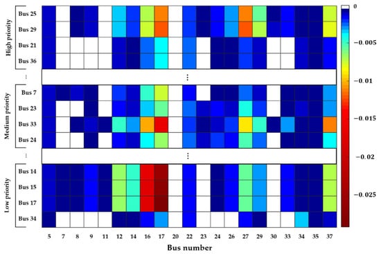 Figure 3 shows the voltage stability heatmap for the relationship between all candidate placements for a newly installed ESS and all load changes in Table 2. This heatmap clearly and graphically shows the voltage stability between all candidate placements for the new ESS and all loads according to the power sensitivity matrix in (7). The dark-red and white colors represent the highest sensitivity and zero sensitivity, respectively.