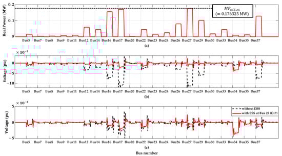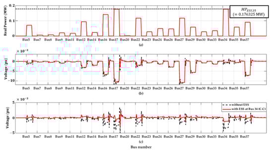 The new ESS was installed at the optimal placement (bus 25) with the optimal sizing, and the VMS operation was verified by sequential changes in all loads. Figure 4a shows the real power response of the newly installed ESS, and Figure 4b,c show the bus voltage deviations at the installation placement (bus 25) and at bus 34. The ESS connected to bus 25 can respond to all load changes within obtained by (10), and as a result, the voltage stability of bus 25 is improved. Due to the influence of the ESS connected to bus 25, the voltage deviation of bus 34 is also slightly reduced compared to when the ESS is not connected.