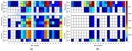 The loads on buses 16 and 17 are the largest in the microgrid, as shown in Table 2. As a result, as shown in Figure 3, the changes in the load on buses 16 and 17 have a significant effect on the voltage stability of all the buses. Buses 25 and 29 have a significant impact on the load changes of almost all the buses and have relatively small values, as shown in Table 3. On the other hand, buses 14, 15, and 17 have very high power sensitivities to changes in loads connected to buses 16 and 17, resulting in high values. Bus 34, which was given the lowest priority by the proposed algorithm, has the weakest power sensitivity compared to other buses, and it has the largest value.