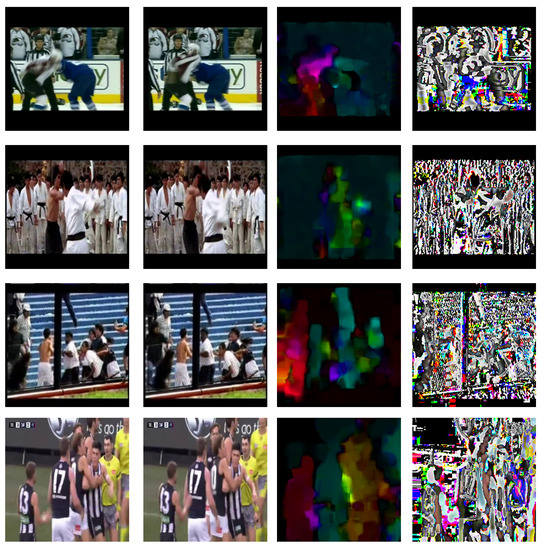 Transformation of sequences of two consecutive frames, of four violent scenes for each dataset (columns 1 and 2), in their dense optical flow (column 3) and adjacent frame subtraction (column 4). The color in (column 3), is for better visualization.