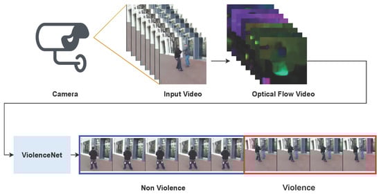The ViolenceNet model allowed classifying videos between the categories of violence and non-violence. In a CCTV system, our model worked with short video fragments of equal length. Each of these fragments was preprocessed, applying the dense optical flow algorithm that generated the input to the ViolenceNet model that was in charge of classifying these fragments into violence or non-violence, as shown in Figure 3.