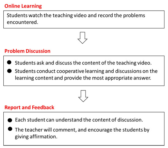 The FC emphasizes the use of digital technology to flip the learning role of students, encouraging students to read the learning content through teaching videos before class, and then discuss the topics during class to complete the learning. Because of this student-centric learning, the method is generally affirmed, and the learning effect of students is quite significant. Therefore, the FC has become a learning model that has attracted much attention in the education field. Figure 1 shows the implementation process and steps of the flipped course. The first stage is online learning, and students watch the teaching video, record the problems encountered. In the second stage, they ask and discuss the content of the teaching video. Then, students’ questions are collected and answered. Students conduct cooperative learning and discussions on the learning content and provide the most appropriate answer. The third stage is to report and give feedback. The group members guide each other to ensure that each student can understand the content of the discussion. Following the student report, each team will feed back, then the teacher will comment, and encourage the students by giving affirmation to the students [5].