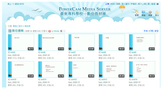 The DL course in 2019 was given in the FC model, with the participation of a total of 31 students who formed an experimental group. The independent variable was the teaching strategy of the FC model and the dependent variable was the learning performance of the learners in the DL course. The lecture video was uploaded to the channel of the lecturing teacher in the school’s E-media cloud and each student had his/her account to log in and watch the video, as shown in Figure 2. In addition to the lecture video, relevant PowerPoint slides with the content lectured in class were also uploaded to the school’s E-learning platform for students who took the course to watch and download, as shown in Figure 3. It was confirmed after the survey that all students had personal computers, laptops or mobile phones to access the video and PowerPoint slides. In addition to the above devices, students were also allowed to use computers for such download and watching in the computer room during opening hours of the school’s library. Through the Taiwan Academic Network (TANet) or the telecommunications network provided by the telecommunication providers, students were able to watch the lecture videos and PPT slides at any time. The course implementation process is shown in Figure 4 with the details as follows: