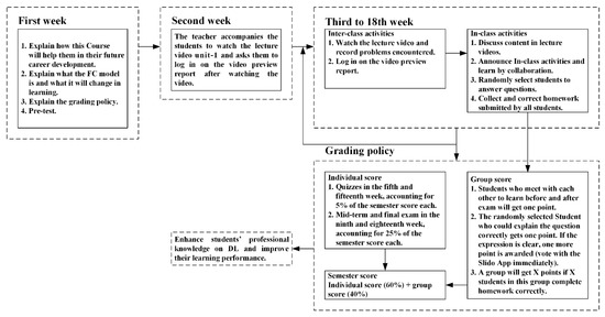 - In the first week, students were told how this course would help them in their future career development, in order to stimulate their learning motivation, whilst what the FC model was and how it could change their learning were also explained to them. The grading policy and the goal to learn the DL course under the FC model by improving their learning motivation and learning performance were also explained to them. Then, the pre-test was conducted. The scores were not included in the semester grade and were only served as a reference for the teacher to understand the students’ levels. After that, students were grouped according to the grade, and the high-scoring students were distributed in each group so that students with weaker foundations could be helped.