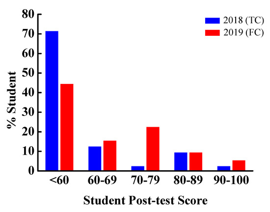 Although the post-test scores of students in the experimental group in DL courses were significantly higher than their pre-test scores, it could not be concluded as a subsequent result of the intervention of the FC model. Therefore, the DL post-test scores of students in 2018 (the control group) and in 2019 (the experimental group) were taken as independent sample t-test to examine the impact of the FC model intervention, and the test results were shown in Table 2. The average post-test score in 2019 was 60.0323, displaying a rise in the post-test scores and a fall in the standard deviation than those in 2018. It is worth noting that, in addition to the narrowing of the gap between the lowest score and the highest score under the FC model, the passing rate of students also exhibited a significant increase. As shown in Figure 7, the percentage of students with a score below 60 decreased while the percentage of students with a score of 60–69, 70–79 and above 90 increased. The examining significance of the Levene test is 0.278 > 0.05 and the null hypothesis assuming that the population variance is equal should be accepted. Therefore, the test results in the “Assuming equal variance” column yielded the conclusion that the t value was −3.012 and p = 0.004 < 0.05; it has reached a significant level which means that there was a significant difference between the scores of the control group and experimental group. That is to say, followed by the intervention of the FC model, the learning performance of students in the DL courses has significantly improved. This result is consistent with that of previous studies.