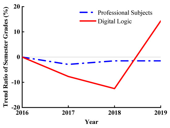 As shown in Figure 8, it can be found that from 2016 to 2019, the semester average grades of professional subjects (C programming, Calculus, Electronic Circuit, Circuit I) showed a downward trend, which the trend ratio can see is all negative. From 2016 to 2018, DL semester grades also showed a downward trend. Therefore, according to the assumption of parallel trends, in 2019, DL semester grades should also continue to decline. However, after applying the FC model, the average semester grades of professional subjects continued to decline, with a trend ratio of −1.51%. Still, the DL semester grades did not decrease but rose instead, and the trend ratio changed from negative to positive to +14.3%.