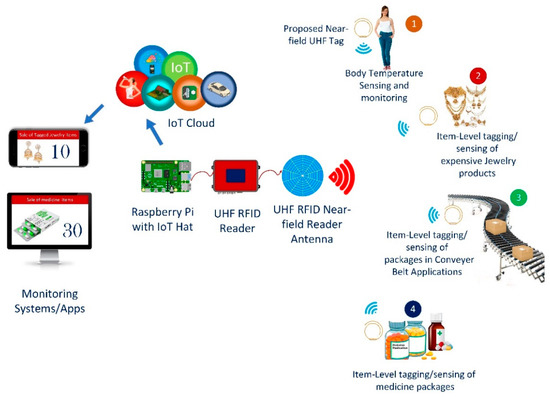 The proposed tag can be readable from very close proximity. It achieves three times more read distance as compared to frequently-used commercial near field tag (Impinj J41) with 10 dBm transmission power, thereby greatly reducing the pressure on reader antenna designers. The proposed tag design is used to demonstrate tagging applications, such as item-level tagging of jewelry items, as shown in Figure 1. Furthermore, since the tag reading mechanism is based on magnetic field characteristics thereby, it can be used in many sensing and tagging applications [27,28,29,30] in collaboration with IoT technology, as shown in Figure 1. For IoT technology assistance, a raspberry pi based setup with LoRa IoT Chip HAT was utilized to connect the RFID reader. The LoRa device provides the connectivity using the LoRa gateway, which helps to store data on the IoT cloud. The data from the IoT cloud can be retrieved for illustration purposes using Web Apps.