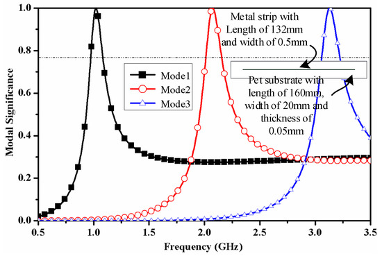 By TCM theory, we can get physical insight into a metal object’s radiation pattern and near field without any external feed excitation. So, we can search for a suitable structure that meets the requirement by analyzing its characteristic field. Figure 2 shows the modal Significance (MS) values of the first three characteristic modes of the metal strip (the length of metal strip is chosen as half-wavelength of 915 MHz), characteristic current distribution, and the characteristic near magnetic field associated with these modes (the relative dielectric constant of PET material is 4). Figure 3a–c show the vector distribution of the characteristic current corresponding to the maximum MS value of mode 1 to mode 3 and the corresponding Z component (Hz) of the characteristic magnetic field at Z = 1 mm (the positive value is taken in the +Z direction and the negative value is taken in the -Z direction). It is worth to mention here that the strip is placed in xy-plane. The characteristic current of mode 1 shows a similarity with the half-wave mode (associated to 915 MHz) current of a dipole. Moreover, mode 1 exhibits open characteristic magnetic field distribution, and its normal component has symmetrical distribution about metal strip structure in Z = 1 mm plane.