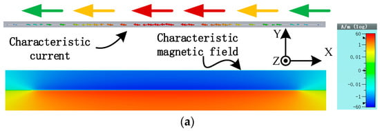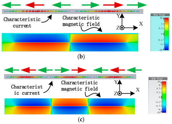 Characteristics mode current and associated magnetic field profile of metal strip (observed at frequency with maximum MS value) (a) mode 1 (b) mode 2 (c) mode 3.