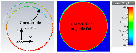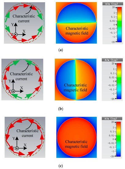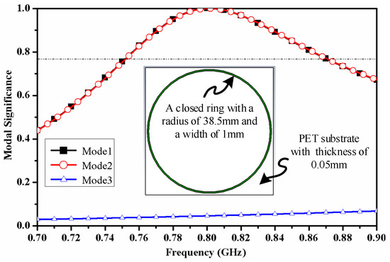 Figure 4 shows the MS values of the first three characteristic modes of the closed-loop, the distribution of the characteristic current and the magnetic field characteristics (the relative dielectric constant of PET material is 4). Figure 5a–c show the vector distribution of characteristic current at 800 MHz and Z component of the characteristic magnetic field at z = 1 mm for mode 1 to mode 3. The MS values of mode 1 and mode 2 of the closed metal ring reach the maximum at 800 MHz, and it can be seen from the current distribution that mode 1 and mode 2 are a pair of degenerate modes. It can be seen from Figure 5a,b that the magnetic field distribution of mode 1 and mode 2 in the closed metal ring is symmetrical about a midline, with the same amplitude and opposite direction. Therefore, the total magnetic flux in the closed metal ring is zero, since the two modes cannot obtain energy from the uniformly distributed normal magnetic field. Looking at Figure 5c, the current flow direction in mode 3 is not reversed, and the values are equal. Therefore, the magnetic field distribution in the closed-loop is in phase, and the corresponding magnetic field on concentric circles is the same. Considering that, in the UHF band RFID magnetic field coupled antenna system, the magnetic field distribution generated by the reader antenna is uniform and in phase in its normal plane. If only focusing on the field distribution, mode 3 can obtain energy from the magnetic field generated by the transmitting coil. However, the MS value corresponding to mode 3 is very small in the whole frequency band. If the excitation is introduced, the current flow direction cannot be reversed in the small electric size. Therefore, for the closed ring structure, it is not possible to expand the size of the closed-loop without changing the current flow direction. Moreover, it is convenient to make a good conjugate matching in such a small size.