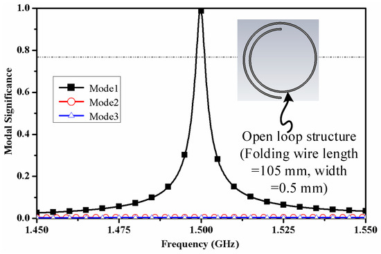 For choosing electrically small structure, we run CMA for open loop structure with overall length of 100 mm. After running some rigorous simulation tests, a structure with 105 mm was selected for demonstrating required performance at 1.5 GHz. The open structure dimensions were taken by folding 105 mm length wire to the center line. Figure 6 shows the MS values of the first characteristic mode of the open-loop structure. The proposed open-loop structure shows a peak MS performance at 1.5 GHz. Similarly, Figure 7 shows the distribution of the characteristic current and associated characteristic magnetic field (the relative dielectric constant of PET material is 4). In mode 1, MS reaches the maximum at 1.5 GHz. By observing the characteristic magnetic field distribution of mode 1, it can be concluded that the near-field magnetic field distribution of this structure is similar to that of mode 3 of the closed-loop. Therefore, the open loop structure has the ability to receive energy from the near-field magnetic field.