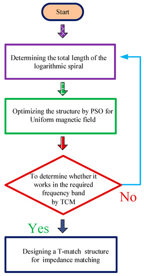Therefore, in this paper, a novel inkjet-printed logarithmic spiral UHF RFID near-field tag, based on TCM and PSO, is presented. The benefit of the logarithmic spiral structure lies in its inherited uniform and large magnetic field receiving area that can be extended to achieve a higher reading distance. TCM can define the potential radiation capacity of a conductor with inherent structure along with near and far-field characteristics. Since the antennas’ receiving and transmitting characteristics are reciprocal, the PSO is used to optimize the antenna structure to have a uniform magnetic field in the normal phase plane. After the radiation structure is determined, a T-match matching circuit is used to meet the conjugate match with RFID chip impedance [27]. The performance of the proposed design was tested by adopting the same chip as used by the commercial tag (J41). Moreover, to get a robust comparison, the same reader antenna was used for tag reading by previously published researches [12].