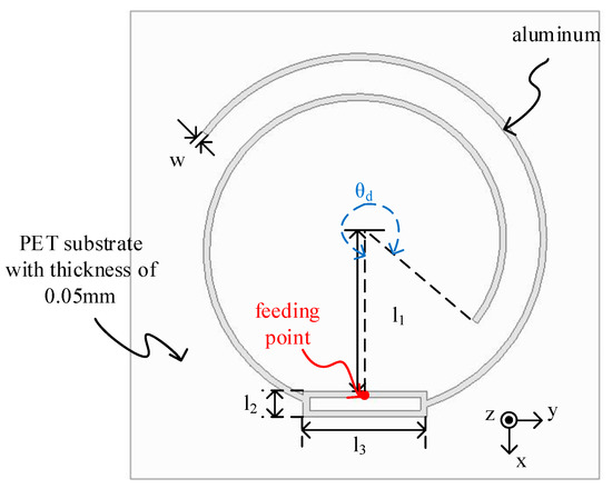 Figure 10 shows the structure of the proposed antenna, which consists of a logarithmic spiral and T-match structure. Table 1 gives the detailed parameters of the proposed design. To compare the performance, we chose the same antenna material, substrate, and chip (Monza 4 QT with impedance 11-j143 Ω) as the commercial tag. The substrate is PET material (relative permittivity is about 4) with a thickness of 0.05 mm. The antenna was printed using aluminum ink. The width of every line in this structure is 0.5 mm. As mentioned above, the excitation should place at the maximum of the characteristic current point, which can be estimated as θ = θd. For the T-match matching structure, it should be flat to avoid influencing the characteristic mode of the logarithmic spiral.
