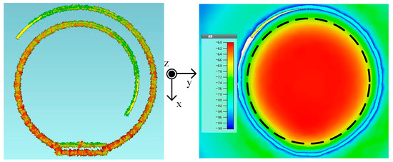 For practical application, the near-field RFID systems usually require a read distance of about 0–10 cm. As we know, the RFID chip activation determines the reading distance of the whole RFID system. In previous researches, most of them use the commercial button tag as a test label to prove the uniformity of magnetic field in normal determined height. However, the electric-small antenna’s energy reception capability is limited by its size, so if we want to achieve an expected height, the transmitting power of the reader antenna should be enhanced. Unfortunately, the in-phase current loop also has an about 2 dBi omnidirectional gain in the azimuth plane. In the case of high transmitting power usage, it is very easy to read other distant tags, which are unwilling for most of the practical application scenarios. So, the tag’s energy reception capability should be enhanced. It is worth noting that just increasing the radius of the tag’s antenna is not a good way because, when the radius of the antenna increases, the uniformity of the electric-small ring’s current and magnetic field will be changed. Moreover, the near-field UHF RFID tag antennas [15,16] get very little attention compared with the reader antenna. Therefore, the design of a near-field tag antenna with uniform magnetic field characteristics, simple structure, and 100% reading rate is still challenging for many practical applications.