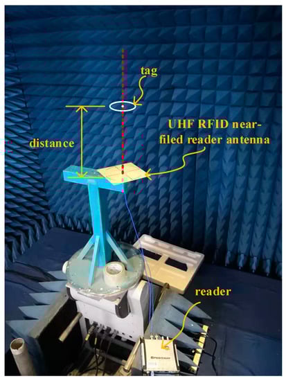 Figure 13 shows five tested tags, which are numbered as tag1 to tag5. Tag1 is our proposed tag, and tag2 is the commercial button tag, which has the electric-small loop. The tag3, tag4, and tag5 are printed in the PCB substrate, and the chips of them are all H4 SOT packaging. Tag3 is based on the same theory as the proposed tag in this paper. The antenna of tag4 and tag5 are both full-wavelength loops, and tag4 is the miniaturization of tag5. A near-field antenna in the published paper is used as the reader antenna [5] to test the performance of the five tags. Figure 14 shows the test environment, which is a semi-open microwave anechoic chamber. The setup was explored using different transmit power levels for testing read range and further specifying the integration zone. The maximum read distance, which is tested by the center to center of the tested tag and the reader antenna is recorded in Table 2.