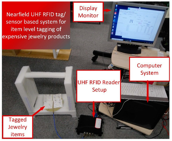 Finally, the proposed tag antenna was used experimentally for item-level tagging of jewelry products, as shown in Figure 15. The setup consisted of a foam-based frame, near-field reader antenna, RFID reader, and tagged jewelry products. The proposed tag/sensor exhibited 100% reading accuracy up to 46 cm with transmit power of 30 dBm. In addition to this, the proposed tag antenna can be exploited for temperature sensing of the human body as its main working principle is based on the magnetic field that is significantly less affected by permittivity changes.