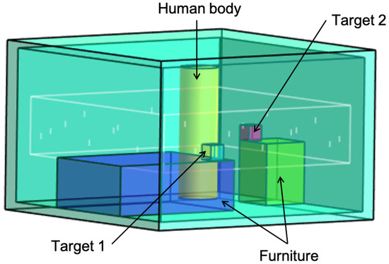 The performance of the proposed WPT approach is tested over a realistic 3D indoor scenario mimicking an office environment (see Figure 2). Indeed, WPT can be relevant not only in industrial applications, but also for domotics in order to design smart homes and offices. The considered environment consists of a m3 room filled with air ( and S/m, where and are the relative electrical permittivity and conductivity, respectively). The room is surrounded by concrete walls of 20 cm thickness with electrical properties and = 10 mS/m. Inside the room, some furniture with size cm3 (, = 1 mS/m) and cm3 (, = 10 mS/m) are also considered (see green and violet parallelepipeds in Figure 2). Moreover, a human body is considered inside the room, modeled as cylinder with radius 25 cm and height 1.7 m with electrical properties equal to the average between fat and muscle tissues (, = 0.4 S/m)—see the yellow cylinder in Figure 2. Finally, two devices are modeled as two plastic cubes with side length 20 cm and electrical properties and = 10 mS/m (see the light blue and magenta squares in Figure 2).