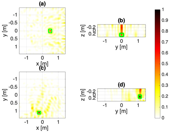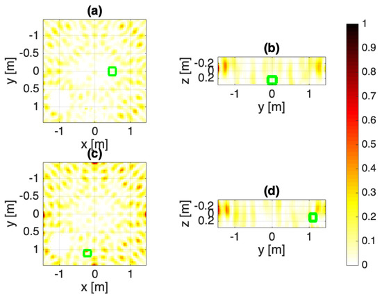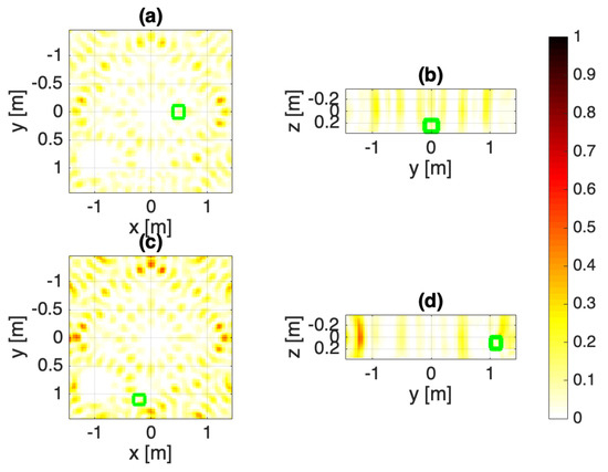 Configuration B: Single WPT. The normalized squared field amplitudes: (a,b) target 1, (c,d) target 2. The target objects are marked as green squares.