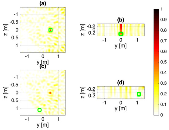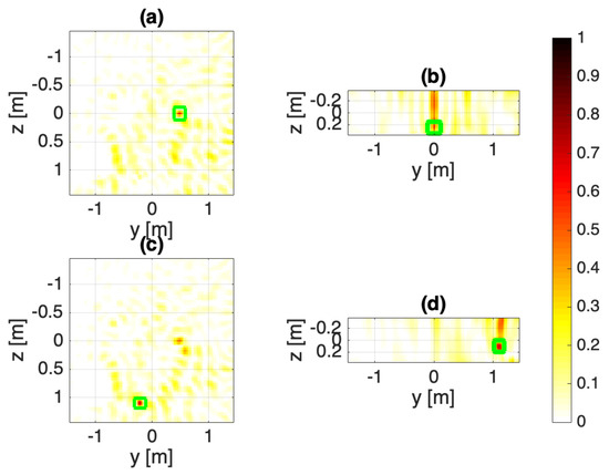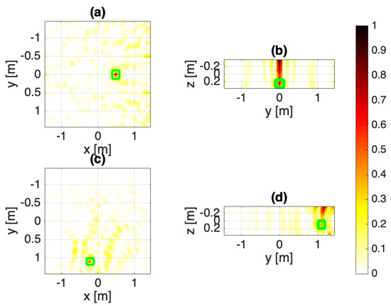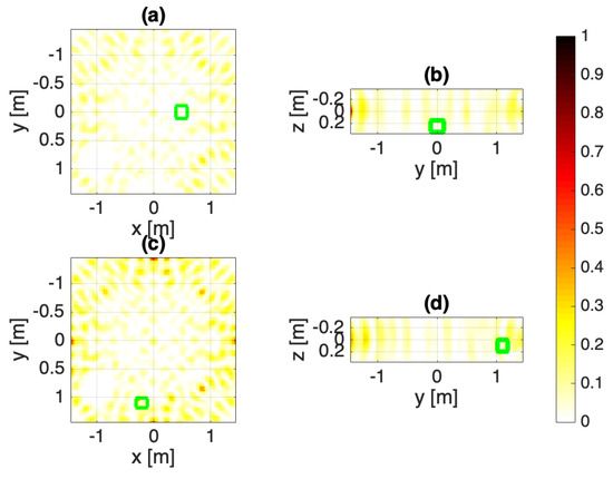 Configuration B: Array fed with unitary excitations. The normalized squared field amplitudes: (a,b) target 1, (c,d) target 2. The target objects are marked as green squares.