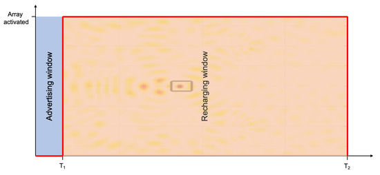 As depicted in Figure 12, in a fixed advertising window of time duration , by using a proper communication technology that depends on the available infrastructure (e.g., Bluetooth Low Energy, LoRA, or Wi-Fi), the devices transmit to the antenna arrays an RF signal, together with their device identification (ID) and charge levels. By using the device ID, containing information about the device class, the array detects the minimum requested field intensity for the replenishment task for every device. Then, by combining the requested field intensity with the remaining charge level, a proper ordered list of replenishment priority is created. The ordering strategy can be application specific (considering special priority) preferred replenishment hours, etc.