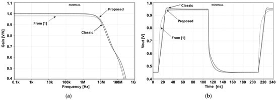 The buffers were compensated to obtain similar −3-dB frequencies in small-signal characteristics (Figure 3a) as well as minimal overshoots under pulse excitation (Figure 3b). The applied values of the compensating elements, RC and CC, are given in Table 1. Some small overshoot still exists in the classical buffer impulse response, and of course this can be suppressed, but then the −3-dB frequency will be lower. The circuit of [1] features the best positive slew rate (SR+), but it results from the fact that the increase in gain error causes an increase in IDS6 (the larger the difference in Vin − Vout, the larger VGS6 becomes).