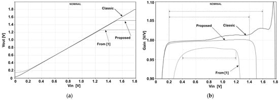 The detailed characteristic of the gain error can be determined directly from a derivative of the static responses in Figure 4a. The gain error is the deviation of the derivative from 1, i.e., gain error = dVout/dVin − 1. The plots of derivatives presented in Figure 4b show that, for low Vin, the classic solution has the smallest gain error. However, the gain error integrated across the entire available input range is the smallest in the proposed circuit (the available ranges are marked in Figure 4b and are determined by the boundaries beyond which the derivatives sharply change their value). The integrated gain errors are 1.2%, 2.3%, and 0.3% for the classic, from [1], and proposed circuits, respectively.