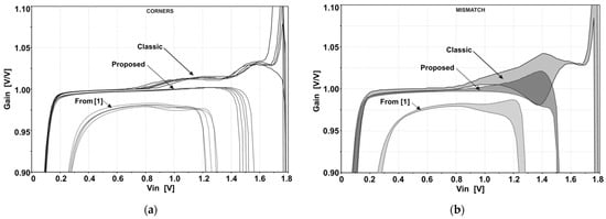 The influence of the process spread and mismatch on the gain is depicted in Figure 5a,b, respectively. All the buffers show a relatively small sensitivity to process spread. However, the mismatch increases the gain error near the upper boundaries of the input ranges.