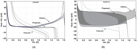 The process spread and the mismatch also cause an offset between Vout and Vin. Figure 6a,b show the difference (Vout − Vin) under conditions of process spread and mismatch, respectively. Note that (Vout − Vin) contains both the offset and gain errors. However, (Vout − Vin) is dominated by the offset error. The process-induced offset (Figure 6a) is the highest in the topology of [1] because M1-M2 and M6 are opposite-type. On the other side, the mismatch-induced offset (Figure 6b) is similar in all of the topologies because it is determined mainly by the matching of transistors in the first stage. An aggregated (process + mismatch induced) offset is comparable in all the topologies, and is 6.58 mV, 6.29 mV, and 6.48 mV (1 sigma) for the circuits in Figure 1a–c, respectively.