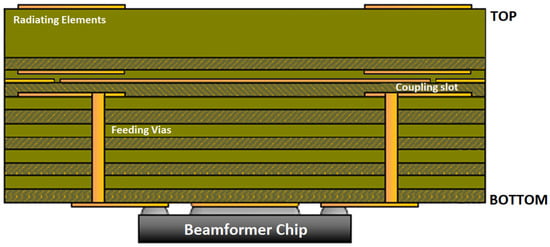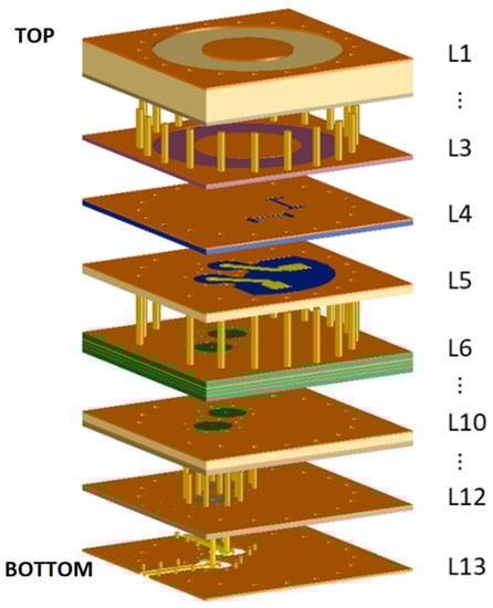 This PCB can be divided into four functional parts: Antenna elements are implemented using layers from L1 to L6. Layers L6 to L10 are used for routing DC power and the serial-peripheral interface (SPI) bus to program the beamformer chips. Layers L10 to L12 are assigned to the RF signal distribution network in stripline technology with integrated Wilkinson power dividers, and finally, layers L12 to L13, interconnection lines between PCB and surface mount components in grounded coplanar waveguide (GCPW) technology, are integrated.