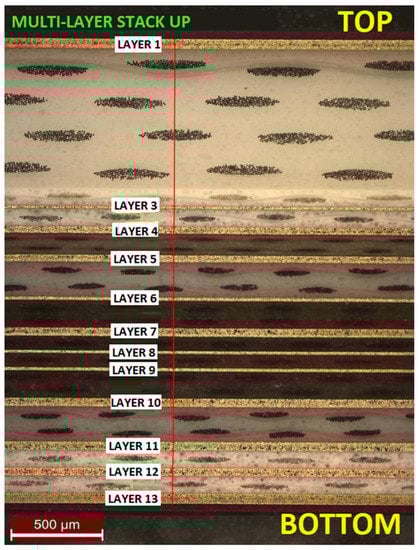 Within current flat antenna technologies, a multilayer structure printed circuit board (PCB) has been chosen for the overall design, due to its low cost and mass production approach. Figure 3 shows a microphotography of a transversal cut of the manufactured PCB, in which the multi-layer stack-up structure consists of thirteen copper layers and different dielectric substrates, alternating cores and prepregs.
