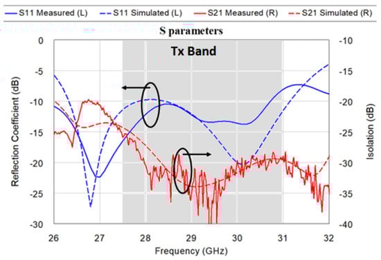 The S-parameters of a single radiating element, which are shown in Figure 5 and Figure 6, have been measured using a 40 GHz vector network analyzer. The radiating element achieves a 10 dB impedance bandwidth that is roughly 16.5 %, which is greater than the Ka-band requires, and it overcomes the bandwidth achieved in recently published works, such as [27,28], 5%, and [29]. The isolation between ports is lower than −25 dB from 27.5 to 31 GHz. Simulation and measurement outcomes are quite similar, although there are slight differences owing to fabrication tolerances and measurement errors, as well as the uncertainty in the dielectric constant parameter of dielectric substrates at 30 GHz, whose value can be influenced by other characteristics such as the material anisotropy, the substrate thickness, or the copper roughness.