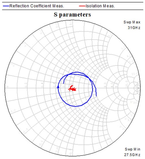 Smith chart of the return loss and isolation results for a single radiating element in the Ka band frequencies from 27.5 to 31 GHz.