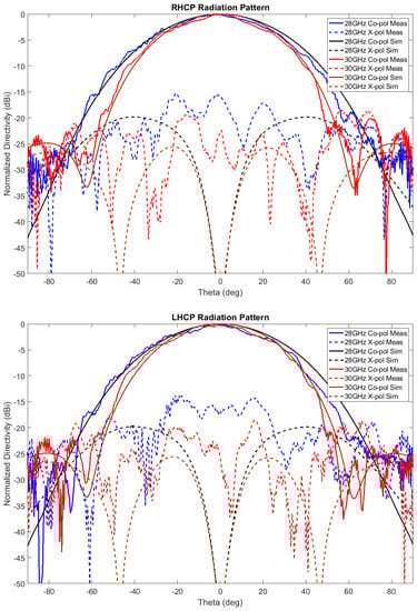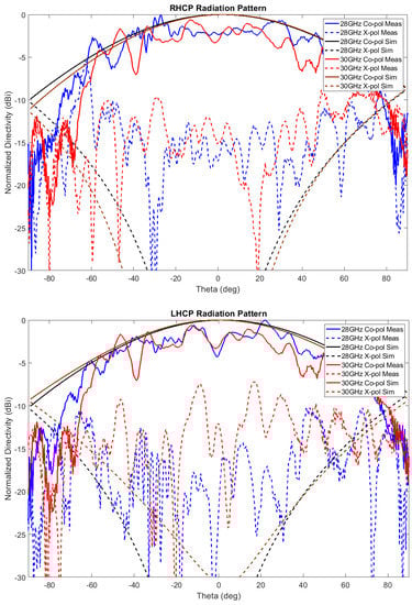 To generate the RHCP and LHCP radiation patterns, we feed the input ports with the same RF signal but with a phase shift between the vertical and horizontal polarization of 90° or −90°, respectively. The RHCP and LHCP normalized radiation patterns in the φ = 0° plane at 28 and 30 GHz are depicted in Figure 7. The measurement results show a ripple caused by the measurement system effect as well as the finite ground plane of the prototype that produces edge diffraction. For both polarizations, 28 and 30 GHz co-polar components show a maximum directivity of 6.5 dBi with a wide beam-width of about 95°.