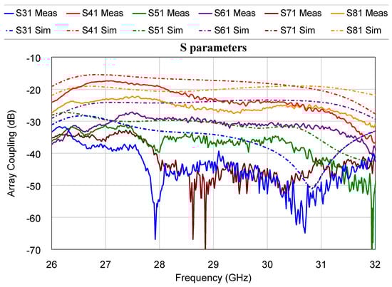 To keep a low active reflection coefficient and acceptable axial ratio of the beam scanning array, mutual coupling levels should be lower than −20 dB [31]. Looking at Figure 5, it is clear that almost all the S-parameters are able to meet this condition in the frequency of interest, showing a worst case of −18 dB in a small frequency band from 26.5 to 28 GHz. Besides, it is verified that the mutual coupling is reduced when the frequency increases because the electrical distance between the radiating elements also increases.