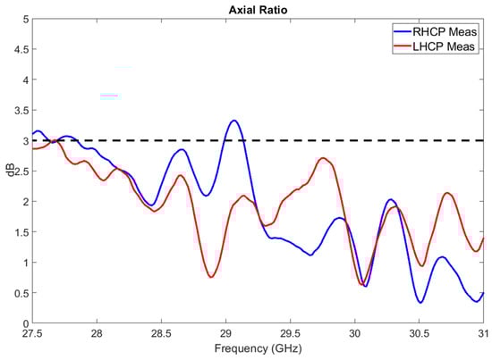 Lastly, Figure 11 shows the axial ratio in boresight as a function of frequency for both polarizations, RHCP and LHCP. In the whole band of interest, values below 3 dB are achieved, ensuring a good circular polarization purity. These data improve when frequency increases.