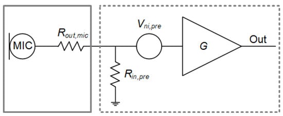 As already mentioned in the introduction, when choosing a preamplifier structure, the input impedance of the preamplifier should be taken into account. With a non-zero output impedance of the microphone, a small input impedance of the preamplifier lowers the effective gain of the preamplifier, leading to noise performance degradation. Figure 1 shows a simplified block diagram of a microphone (in the solid box) and a preamplifier with the gain of G (in the dashed box). The Rout,mic, Rin,pre, and Vni,pre represent the output impedance of the microphone, the input impedance of the preamplifier, and the input-referred noise of the preamplifier, respectively. Then, the effective gain Geff of the preamplifier in Figure 1 can be expressed as