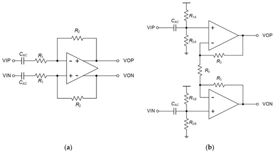 Architecture of (a) resistive inverting preamplifier and (b) resistive non-inverting preamplifier.