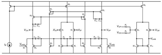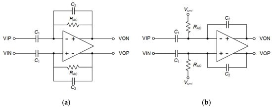 The difference between the structures of Figure 3a,b is the location of the RAC, which sets the input common-mode level of the OTAs. In Figure 3a, RAC are between the input and the output terminals of the OTA and functions as a feedback resistor. In this scheme, the ICML of the OTA becomes the same as the output common-mode level (OCML) of the OTA due to the unity gain feedback at dc. In Figure 3b, RAC are between the virtual ground node at the OTA input and Vcmi. By placing RAC there, the ICML of the OTA is set at Vcmi because no current flows through RAC.