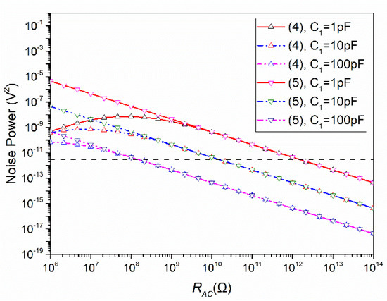 Figure 4 shows the A-weighted output noise power calculated using (4) and (5) as a function of RAC when the gain is 0 dB for several values of C1 (=C2). The upper triangles and the lower triangles represent the noise from (4) and (5), respectively. Solid lines, dash-dot lines, and dash-dot-dot lines represent the noise power for C1 of 1 pF, 10 pF and 100 pF, respectively. The horizontal dashed-line represents the noise power of N1 = 3.2 10−12 V2, which corresponds to 10% of the total noise budget for 100 dB SNR. If the noise from RAC is limited to 10%, then most of the noise budget can be allocated to the OTA, which is advantageous for a low-power design. In Figure 4, we observe that, although the noise powers from (4) and (5) are different when RAC is small, they are essentially identical in the target region below the horizontal line. From Figure 4, we can determine that the required RAC for the noise power to be smaller than N1 are 1.38 TΩ, 13.8 GΩ, and 138 MΩ for C1 of 1 pF, 10 pF and 100 pF, respectively.