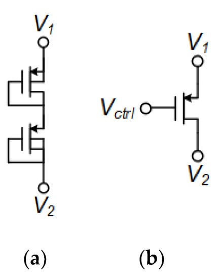 A very large resistance can be obtained by using MOSFETs in sub-threshold or off states. Figure 5a shows a pseudo-resistor consisting of two diode-connected MOSFETs [13,14,15]. In the circuit, if V2 − V1 < 2Vth, where Vth is the threshold voltage of the MOSFETs, the MOSFETs are in the off-state and the pseudo resistor produces a very large resistance. We can easily achieve resistance from several giga-ohms to several hundred giga-ohms using MOSFETs of a small area. If we apply these pseudo-resistors to the preamplifier with capacitive feedback, an on-chip ac-coupling of the preamplifier input can be realized.