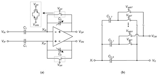 (a) Architecture of the proposed microphone preamplifier and (b) schematic diagram of the capacitor array for C2.