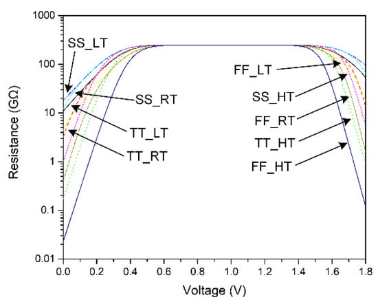 Resistance of the transmission gate switch in the off state simulated at three process corners (TT, SS, FF) and three temperatures (LT = −25 °C, RT = 27 °C, HT = 85 °C).