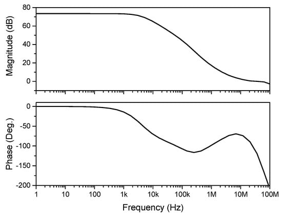It is important to select a proper OTA architecture to achieve the desired performance. For example, a telescopic architecture can be selected when a high gain OTA is required. If the supply voltage is low, an OTA with current source level shifting technique [16] or an OTA with an active load with cross-coupled bulk [17] can be selected. In our work, we adopted a two-stage pseudo class-AB OTA to realize a power efficient low noise OTA. Figure 8 shows the schematic diagram of the OTA used in this work. The OCML of the first stage is stabilized by the resistor R1. A large resistance of R1 = 1 MΩ is used to prevent the open-loop gain reduction. The OCML of the OTA is stabilized by a common-mode feedback (CMFB) circuit employing a simple differential pair. The bias current IB was copied from the reference current that was generated by a conventional constant-gm circuit. Figure 9 shows the AC simulation result of the OTA with the 10 kΩ load resistance. From the simulation, we observe that the loop gain and the phase margin are 73.4 dB and 61°, respectively. The size of the devices in the OTA is listed in Table 2. To reduce the flicker noise, we used large input transistors (W1/L1 = 1664 μm/3 um) and to minimize the thermal noise, gm2/gm1 was made small. Note that the large M1 and M2 lower the bandwidth of the OTA due to its large parasitic capacitances at the output nodes of the first stage. However, the large trans-conductance of the OTA required for a good SNR already leads to a unity-gain bandwidth much larger than the 20-kHz bandwidth of a microphone amplifier. Therefore, the large parasitic capacitance does not become a problem in our design.