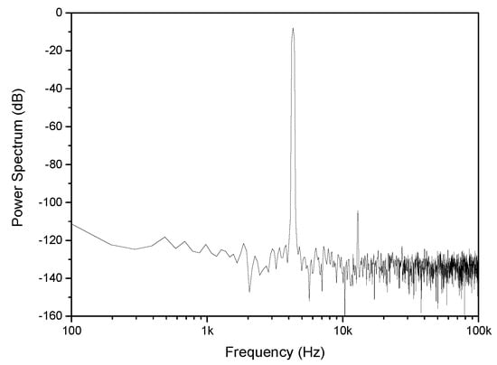 The AC noise simulations of the pre-amplifier indicates that the total output noise is 2.2 × 10−11 V2 (A-weighted) when the preamplifier gain is 0 dB. Of the total noise, the thermal noise and flicker noise contribution are 1.2 × 10−11 V2 and 0.96 × 10−12 V2, respectively. This corresponds to an A-weighted SNR of 101.6 dB. The noise from the pseudo-resistor is less than 1% of the total noise. Figure 10 shows the output spectrum obtained from the transient noise simulation of the proposed preamplifier with the gain of 0 dB with a 4.3 kHz, 800 mVpk,diff balanced input signal. From the result, we obtain the SNR and SNDR of 101.4 dB (A-weighted) and 94.7 dB (A-weighted), respectively.
