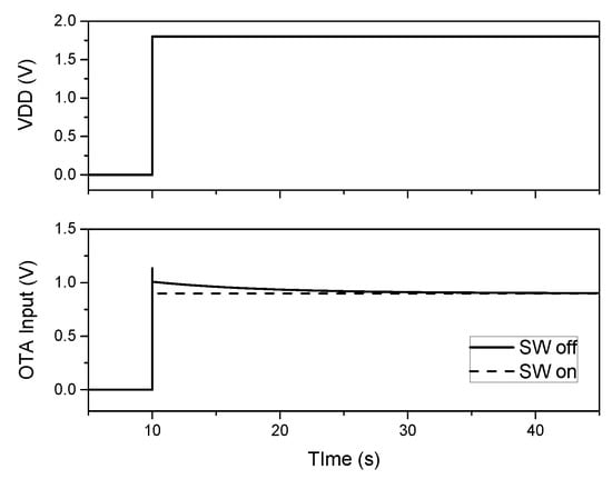 Figure 6a shows the architecture of the proposed microphone preamplifier. The switches are off during the normal operation of the preamplifier (Vctrl = 0), and they are turned on for a short period of time during the start-up (Vctrl = VDD). To reduce the nonlinear characteristics of the switches, the switches are realized as CMOS transmission gates, where the NMOS and PMOS have same size of W/L = 0.25 μm/0.15 μm. It can also reduce the charge injection when the switches are being turned off.