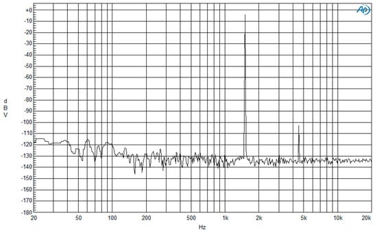Output spectrum of preamplifier for G = 0 dB with 800 mVpk, 1.5 kHz balanced sinusoidal input.