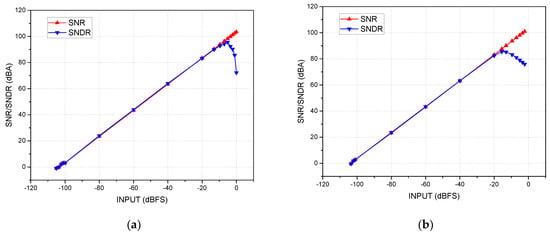 Figure 16 shows the measured A-weighted SNR and A-weighted SNDR versus input level when (a) the balanced signal was applied and (b) the single-ended signal was applied. The maximum A-weighted SNR and A-weighted SNDR with the balanced signal were 107 dBA and 95.5 dBA, respectively. The measured DR of the preamplifier is 107 dB. Maximum SNRs were obtained at the input signal level of 0 dBFS (=1.8 Vpk,diff), which produces the maximum output swing of 1.8 Vpk,diff. With a single-ended signal applied, the peak A-weighted SNDR was reduced to 85.6 dBA mainly due to even-order harmonics. However, the SNRs with a single-ended signal is almost identical to those with balanced input signal.