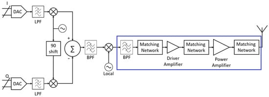 A signal conditioning stage, also known as the amplification and filtering stage, is the last stage before the signal is sent to the antenna to be transmitted. The architecture design presented in this work is well known. Signal conditioning chains are commonly used in biomedical, satellite, cellular, and other applications, which, depending on the application, may include a different type of filter or a number of amplifiers required. In this article, they are composed of a band-pass filter, a driver amplifier, and a power amplifier. The block diagram in Figure 1 shows a typical signal conditioning stage (blue block), where it can be observed that there are some matching networks between stages.